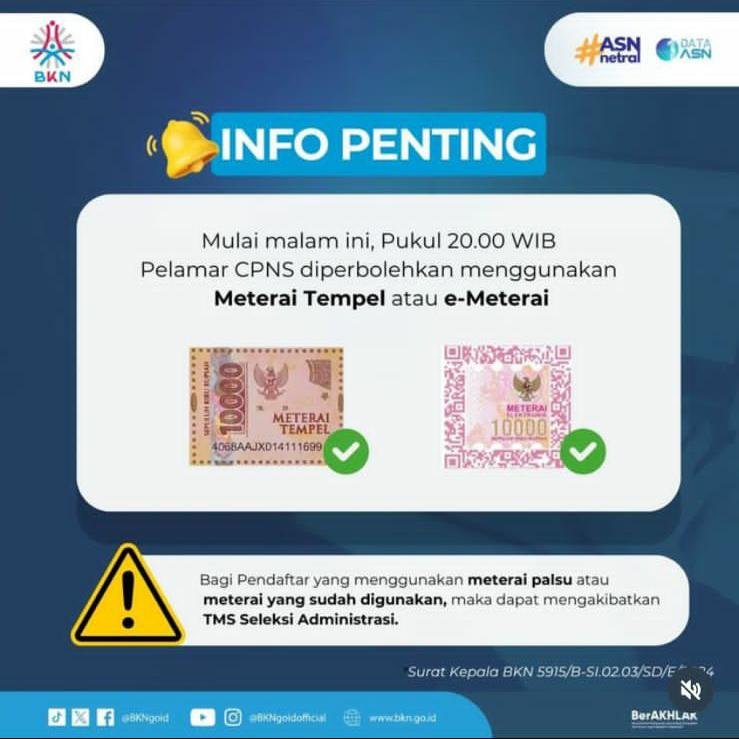 Melalui keterangan di akun Instagramnya, BKN mengatakan untuk peserta CPNS diimbau agar membeli materai 10.000 yang asli di kantor pos atau tempat penjual materai 10.000 yang bisa dipercayai.