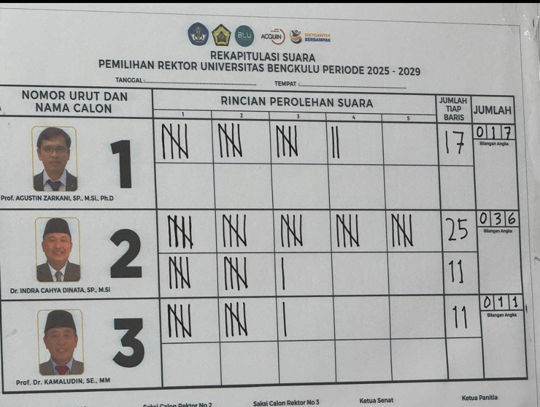 Hasil pemungutan suara menunjukkan Dr. Indra Cahyadinata unggul dengan 36 suara, disusul Prof. Agustin Zarkani 17 suara, dan Prof. Kamaludin 11 suara, sementara abstain 1 suara. Dengan demikian, Dr. Indra resmi ditetapkan sebagai Rektor Unib periode 2025–2029.