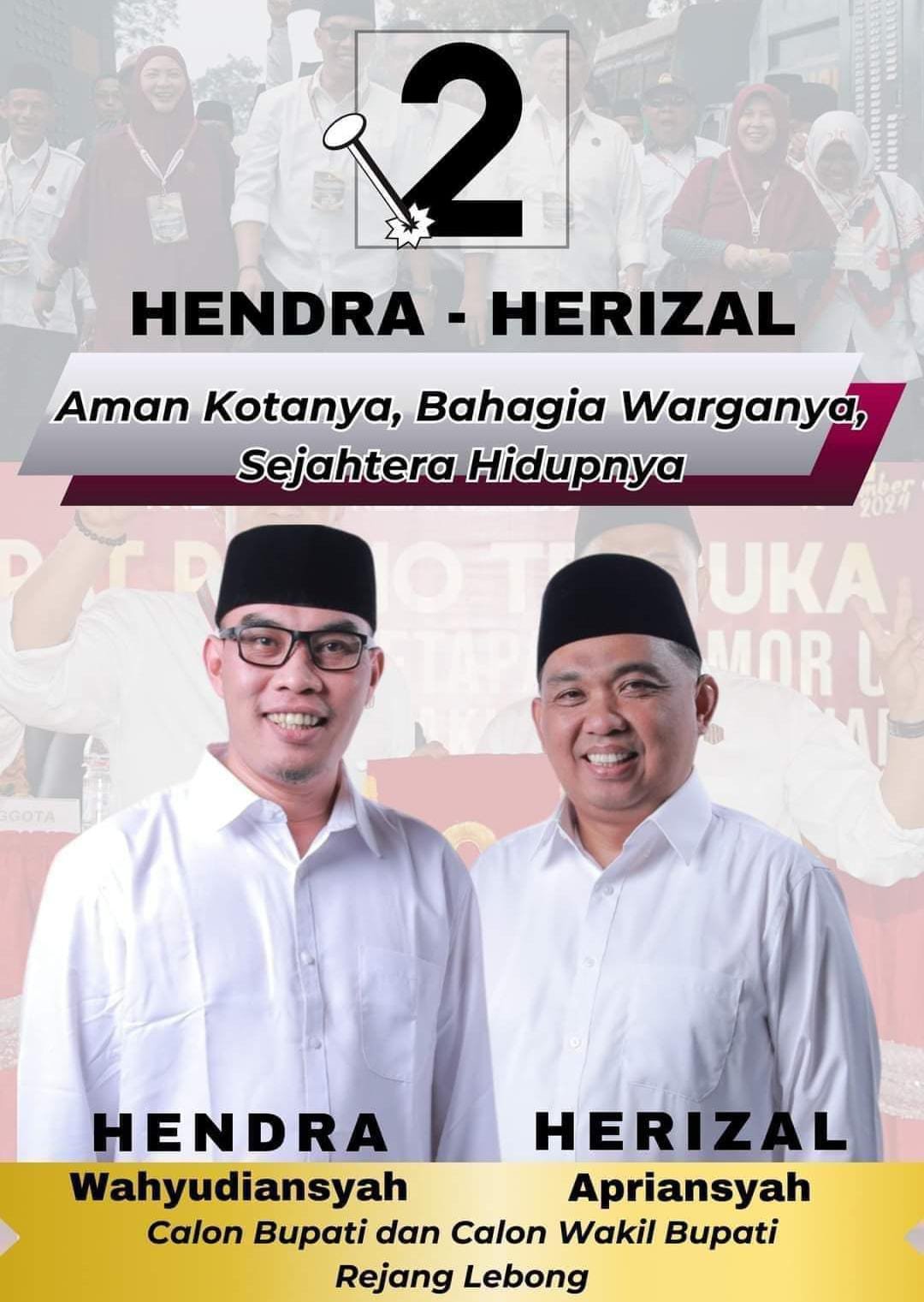 Hendra Wahyudiansyah calon bupati yang merupakan anak dari tokoh berpengaruh di kabupaten Rejang Lebong jauh sebelum dirinya mencalonkan diri sebagai bupati saat ini ia telah aktif di berbagai bidang kemasyarakatan hingga 2019-2024 mengantarkannya menjadi wakil bupati Rejang Lebong yang dikenal ramah, sederhana dan dekat dengan masyarakat