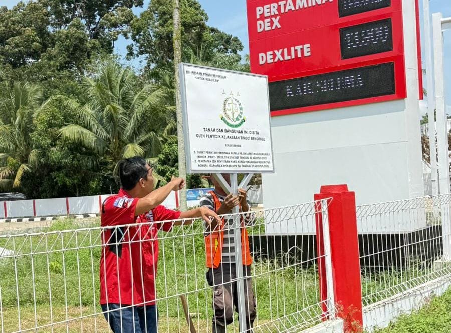 Penyitaan ditandai dengan pemasangan plang resmi oleh tim penyidik Pidsus Kejati Bengkulu yang dipimpin Kasi Ops, Wenharnol. Tim terlihat mengenakan rompi hitam bergaris merah dan mendapat pengawalan dari pihak SPBU.