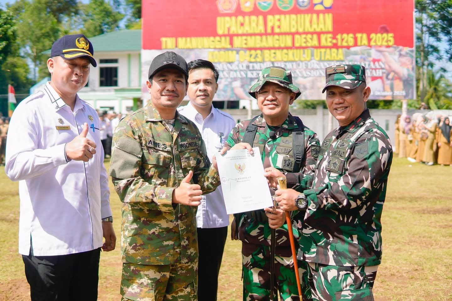 Bupati Bengkulu Utara, Arie Septia Adinata, menyampaikan apresiasi tinggi atas pelaksanaan TMMD yang dinilai sangat membantu pemerintah daerah dalam mewujudkan pembangunan yang merata hingga ke pelosok.